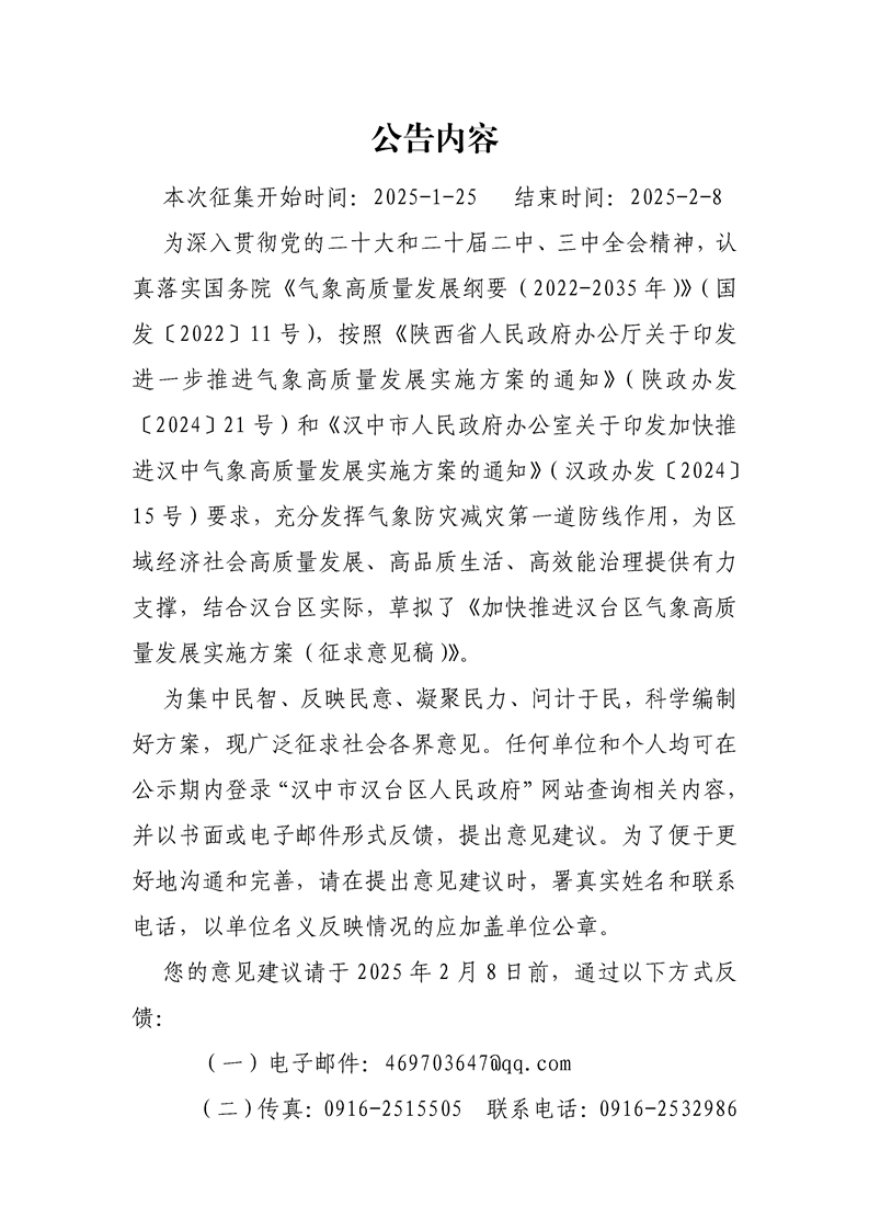 星空电竞app下载苹果版气象局关于征求加快推进汉台区气象高质量发展实施方案(征求意见稿)意见建议的公告