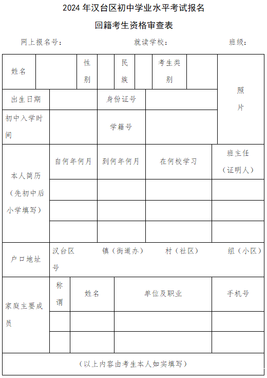 1、填写资格审查表:考生在区招生办中考科领取或自行下载打印《2024年汉台区初中学业水平考试报名回籍考生资格审查表》(见附件),填写表格中个人相关信息;