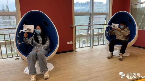 读者正坐在汉台区图书馆数字体验馆里的云图有声听书椅上听书。