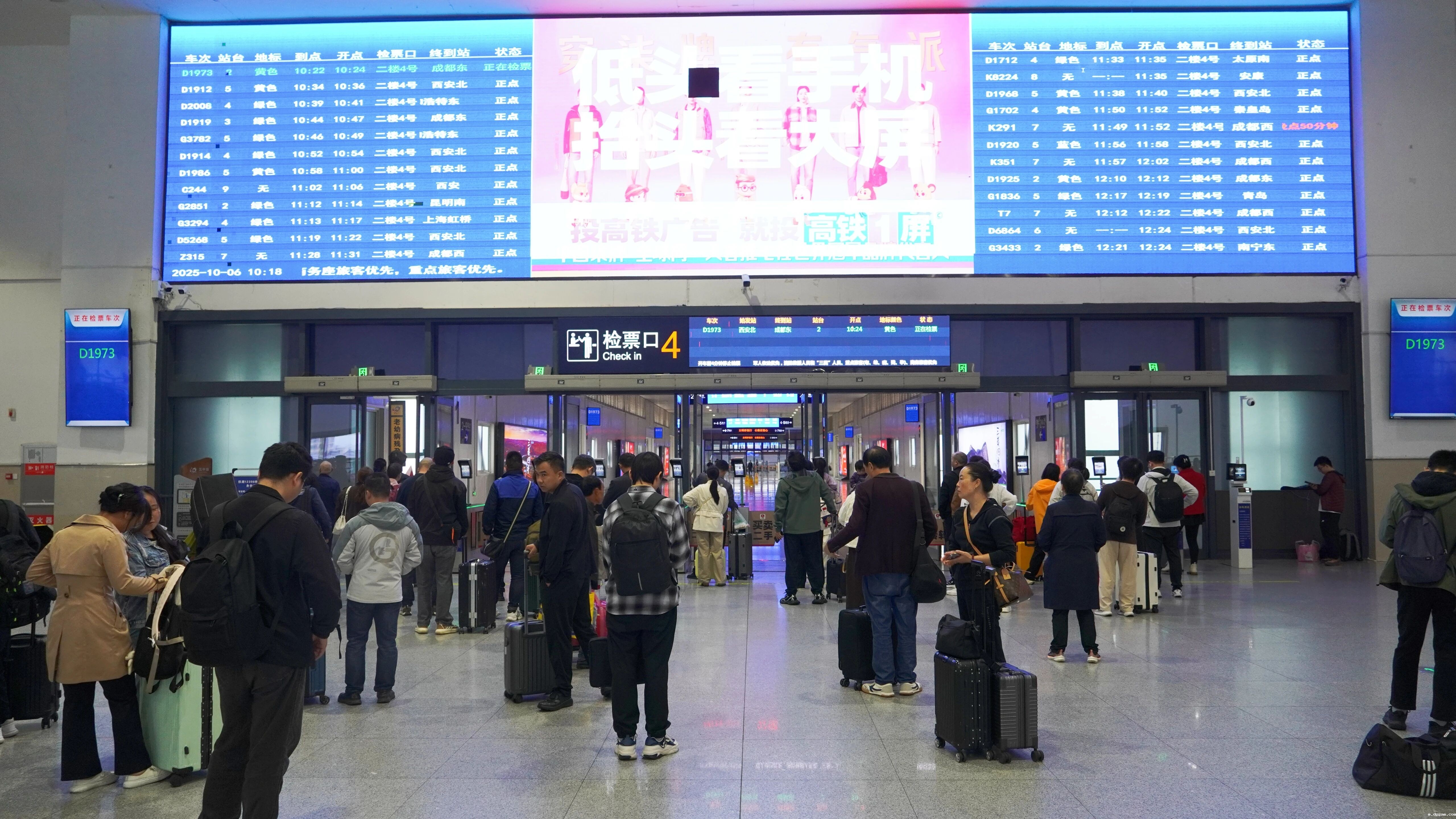 10月6日,记者在汉中高铁站看见候车大厅旅客络绎不绝,工作人员正有序组织候车。安检口处,安检员一丝不苟地查验每一件行李,确保出行安全;售票厅内,工作人员主动协助旅客操作,耐心解答票务问询;检票口处,工作人员手持扩音器清晰提示车次信息,引导队伍依次核验;站台上,工作人员来回巡视,时刻关注列车动态,组织旅客安全上下车。车站各个环节衔接顺畅,保障了旅客的高效出行。
