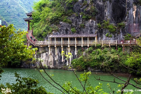 这就是古栈道,它与玻璃栈道不同,是古人在深山峡谷中通行,在悬崖峭壁上凿孔架桥连阁形成一种通道,能通行车马,是古代交通史上一大发明。