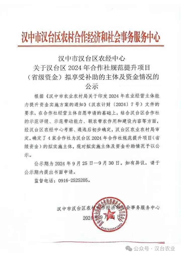 星空电竞app下载苹果版农村合作经济和社会事务服务中心关于汉台区2024年合作社规范提升项目(省级资金)拟享受补助的主体及资金情况的公示