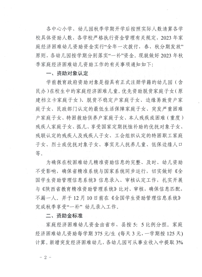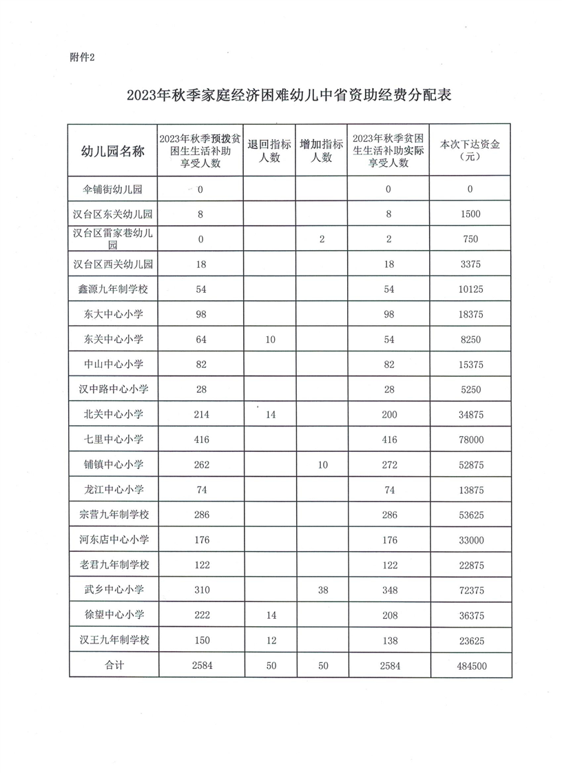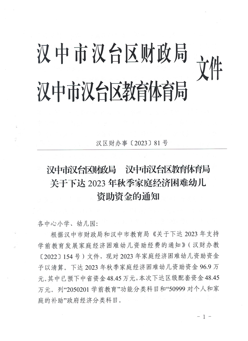 关于下达2023年秋季家庭经济困难幼儿资助资金的通知