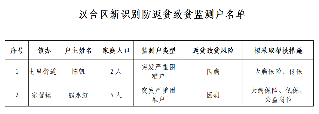 根据防止返贫动态监测和帮扶工作要求,在完成风险预警、入户核实、民主评议、镇办审核、区级审定等程序的基础上,共确定防返贫致贫监测户2户7人,现将人员名单予以公告。