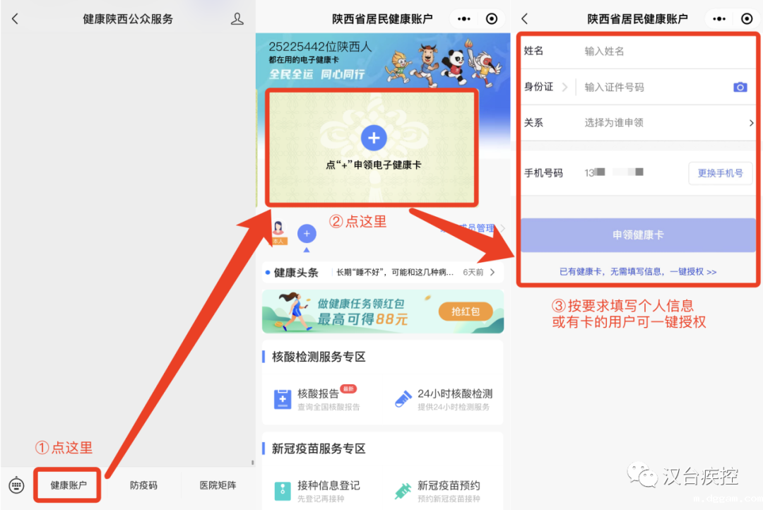 进入公众号,点击底部菜单栏“健康卡”→“健康账户”→“点+申领电子健康卡”→按要求填写个人信息/有卡用户可一键授权→成功申领电子健康卡