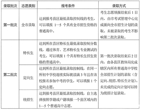 4. 录取批次。全市普通高中录取分两个批次,按照平行志愿,由高分到低分录取。录取批次、志愿设置、报考条件如下: